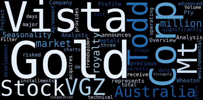 How much time have you spent trying to decide whether investing in Vista Gold? Many investors start with the dream of being free. They expect to find on the stock market an option to have time to develop their own interests and hobbies. That is, a way to escape a 9 to 5 job. However, investment is complex and investors end up spending whole days (and nights) trying to figure out which the right stock to invest is. The dream of stock investing becomes the nightmare of facing infinity amounts of information. As a solution, we programmed an artificial intelligence that reads the whole internet and the uses natural language processing and vectorizers to summarize the information. Usually, the AI reads several hundred pages and summarize it to a short document. This document presents our results. We found that the most common words in the internet about Vista Gold are: Vista, Gold, Corp, Mt, Todd, Stock, Australia, and the most common words in the summary are: gold, stock, vista, home, project, sale, company, . One of the sentences in the summary was: announces $20 million royalty with Wheaton precious metals corp. Other searches related to this term that the AI found were: stockmarketlive, livestock, stockmarketforbeginners, thestockmarket, stockmarkettoday, stockmarkettrading, stockmarketstocks, todaystockmarket, thestockmarket, marketnews, stockmarketnews, whatisstockmarket, usstockmarket, stockmarketopen. #gold #stock #vista #home #project #sale #company.