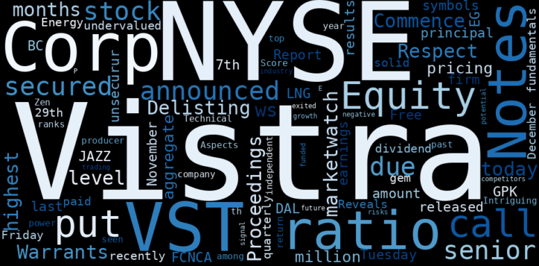 Are looking for the most relevant information about Vistra? Investor spend a lot of time searching for information to make investment decisions in Vistra. This task is often burdensome and consumes huge amounts of free time. It also leads to mistakes due to fatigue and bounded rationality. As a solution, we programmed an artificial intelligence that reads the whole internet and the uses natural language processing and vectorizers to summarize the information. Usually, the AI reads several hundred pages and summarize it to a short document. This document presents our results. We found that the most common words in the internet about Vistra are: Vistra, Corp, ratio, NYSEVST, NYSE, Equity, announce, and the most common words in the summary are: vistra, stock, retail, new, supplier, energy, corp, . One of the sentences in the summary was: (vst.a) - marketwatch.ws.. Other searches related to this term that the AI found were: stockmarketlive, livestock, stockmarketforbeginners, thestockmarket, stockmarkettoday, stockmarkettrading, stockmarketstocks, todaystockmarket, thestockmarket, marketnews, stockmarketnews, whatisstockmarket, usstockmarket, stockmarketopen. #vistra #stock #retail #new #supplier #energy #corp.