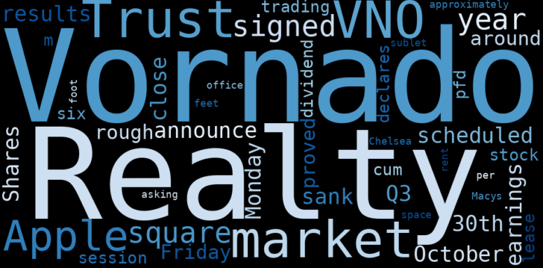 Are looking for the most relevant information about Vornado Realty Trust? Investor spend a lot of time searching for information to make investment decisions in Vornado Realty Trust. This task is often burdensome and consumes huge amounts of free time. It also leads to mistakes due to fatigue and bounded rationality. As a solution, we programmed an artificial intelligence that reads the whole internet and the uses natural language processing and vectorizers to summarize the information. Usually, the AI reads several hundred pages and summarize it to a short document. This document presents our results. We found that the most common words in the internet about Vornado Realty Trust are: Vornado, Realty, Trust, VNO, market, Apple, sign, and the most common words in the summary are: realty, trust, vornado, job, new, stock, real, . One of the sentences in the summary was: Vornado Realty Trust (VNO) is scheduled to announce Q3 earnings results on Monday, October 30th, after market close. Other searches related to this term that the AI found were: stockmarketlive, livestock, stockmarketforbeginners, thestockmarket, stockmarkettoday, stockmarkettrading, stockmarketstocks, todaystockmarket, thestockmarket, marketnews, stockmarketnews, whatisstockmarket, usstockmarket, stockmarketopen. #realty #trust #vornado #job #new #stock #real.