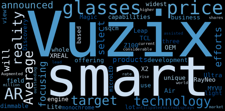 This document will help you to evaluate Vuzix without reading an infinite amount of sources. Relying only on stock quotes or prices to make investment decisions is a mistake. Analyzing and observing stock charts, highs and lows and other numerical data does not allow to evaluate the real value of a company. Stock quotes and prices are the result of underlying characteristics of a company and of events and news happening around them. For this reason, investing must be based on information, not numbers. As a solution, we programmed an artificial intelligence that reads the whole internet and the uses natural language processing and vectorizers to summarize the information. Usually, the AI reads several hundred pages and summarize it to a short document. This document presents our results. We found that the most common words in the internet about Vuzix are: Vuzix, price, AR, smart, glass, technology, target, and the …