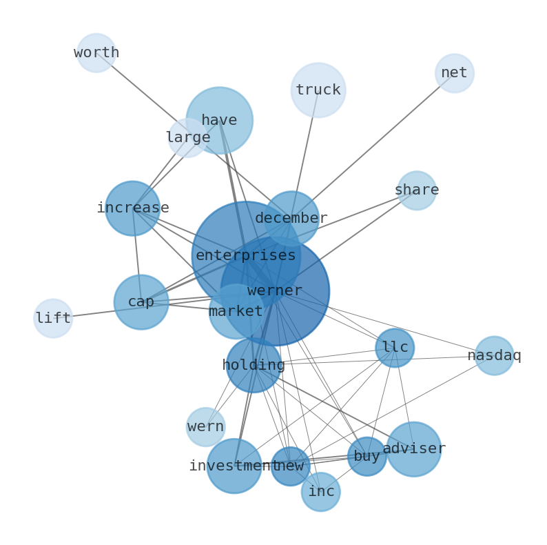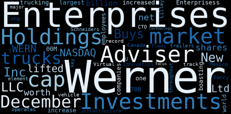 How much time have you spent trying to decide whether investing in Werner Enterprises? Many investors start with the dream of being free. They expect to find on the stock market an option to have time to develop their own interests and hobbies. That is, a way to escape a 9 to 5 job. However, investment is complex and investors end up spending whole days (and nights) trying to figure out which the right stock to invest is. The dream of stock investing becomes the nightmare of facing infinity amounts of information. As a solution, we programmed an artificial intelligence that reads the whole internet and the uses natural language processing and vectorizers to summarize the information. Usually, the AI reads several hundred pages and summarize it to a short document. This document presents our results. We found that the most common words in the internet about Werner Enterprises are: Werner, Enterprises, Adviser, Investments, market, cap, December, and the most common words in the summary are: werner, job, enterprise, truck, driver, enterprises, market, . One of the sentences in the summary was: lifted its holdings in shares of Werner Enterprises. Other searches related to this term that the AI found were: stockmarketlive, livestock, stockmarketforbeginners, thestockmarket, stockmarkettoday, stockmarkettrading, stockmarketstocks, todaystockmarket, thestockmarket, marketnews, stockmarketnews, whatisstockmarket, usstockmarket, stockmarketopen. #werner #job #enterprise #truck #driver #enterprises #market.