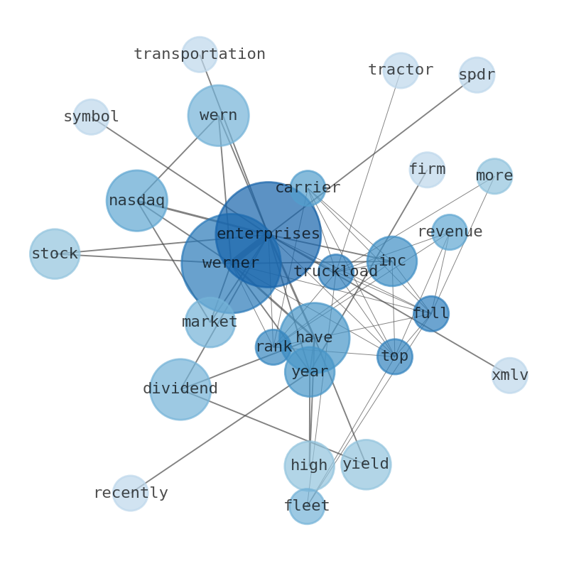 The game is changing. There is a new strategy to evaluate Werner Enterprises fundamental value, possible risks and most salient advantages. Investors have traditionally relied in reading large amounts of text to evaluate the fundamental value of a stock or company. However, the development of Artificial Intelligence (AI) tools is modifying the way investments are evaluated in markets. Today, machine learning, natural language processing and bigdata allow making this process automatic, reducing large amounts of text to the elements that have a higher activation in a neural network. We programmed an artificial intelligence that reads the whole internet and the uses natural language processing and vectorizers to summarize the information. Usually, the AI reads several hundred pages and summarize it to a short document. This document presents our results. We found that the most common words in the internet about Werner Enterprises are: Werner, Enterprises, dividend, NASDAQ, WERN, Inc, yield, …