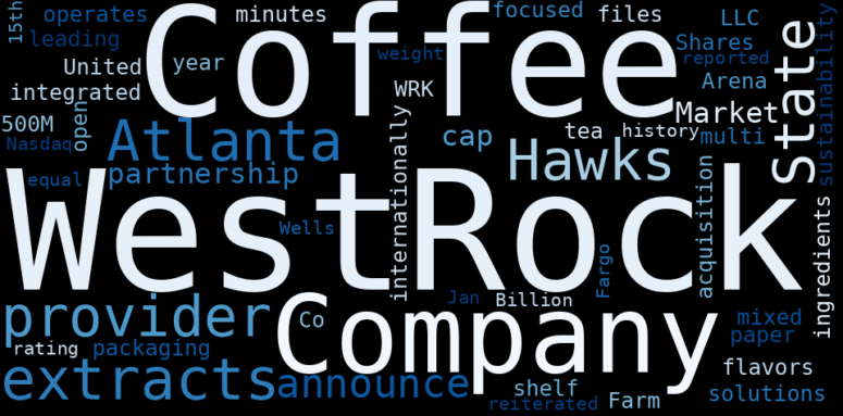 Are looking for the most relevant information about WestRock Company? Investor spend a lot of time searching for information to make investment decisions in WestRock Company. This task is often burdensome and consumes huge amounts of free time. It also leads to mistakes due to fatigue and bounded rationality. As a solution, we programmed an artificial intelligence that reads the whole internet and the uses natural language processing and vectorizers to summarize the information. Usually, the AI reads several hundred pages and summarize it to a short document. This document presents our results. We found that the most common words in the internet about WestRock Company are: Coffee, Company, WestRock, Westrock, extract, provider, Atlanta, and the most common words in the summary are: westrock, company, job, stock, packaging, market, share, . One of the sentences in the summary was: Atlanta Hawks and State Farm Arena announce sustainability-focused partnership with WestRock Company.. Other searches related to this term that the AI found were: stockmarketlive, livestock, stockmarketforbeginners, thestockmarket, stockmarkettoday, stockmarkettrading, stockmarketstocks, todaystockmarket, thestockmarket, marketnews, stockmarketnews, whatisstockmarket, usstockmarket, stockmarketopen. #westrock #company #job #stock #packaging #market #share.