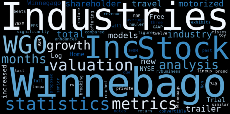The game is changing. There is a new strategy to evaluate Winnebago Industries fundamental value, possible risks and most salient advantages. Investors have traditionally relied in reading large amounts of text to evaluate the fundamental value of a stock or company. However, the development of Artificial Intelligence (AI) tools is modifying the way investments are evaluated in markets. Today, machine learning, natural language processing and bigdata allow making this process automatic, reducing large amounts of text to the elements that have a higher activation in a neural network. We programmed an artificial intelligence that reads the whole internet and the uses natural language processing and vectorizers to summarize the information. Usually, the AI reads several hundred pages and summarize it to a short document. This document presents our results. We found that the most common words in the internet about Winnebago Industries are: Industries, Winnebago, Inc, industry, stock, Stock, month, …