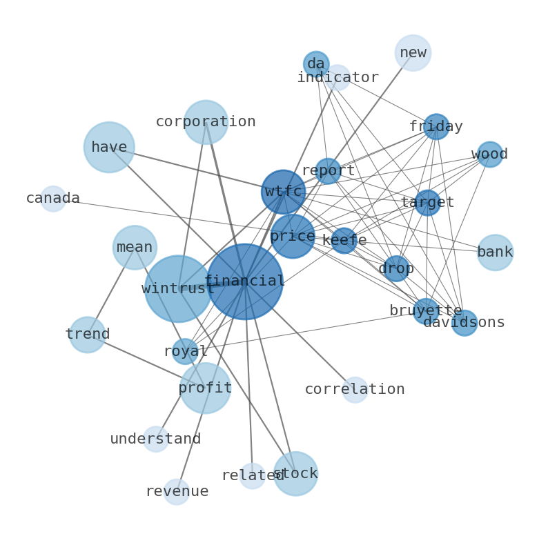 This document will help you to evaluate Wintrust Financial without reading an infinite amount of sources. Relying only on stock quotes or prices to make investment decisions is a mistake. Analyzing and observing stock charts, highs and lows and other numerical data does not allow to evaluate the real value of a company. Stock quotes and prices are the result of underlying characteristics of a company and of events and news happening around them. For this reason, investing must be based on information, not numbers. As a solution, we programmed an artificial intelligence that reads the whole internet and the uses natural language processing and vectorizers to summarize the information. Usually, the AI reads several hundred pages and summarize it to a short document. This document presents our results. We found that the most common words in the internet about Wintrust Financial are: Wintrust, Financial, profit, price, WTFC, stock, Corporation, …