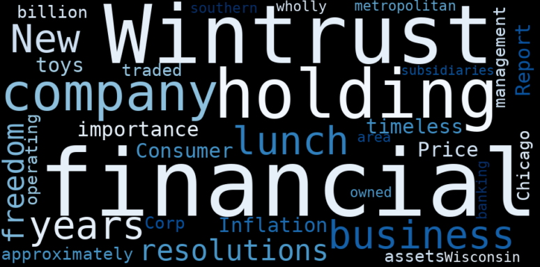 Are looking for the most relevant information about Wintrust Financial? Investor spend a lot of time searching for information to make investment decisions in Wintrust Financial. This task is often burdensome and consumes huge amounts of free time. It also leads to mistakes due to fatigue and bounded rationality. As a solution, we programmed an artificial intelligence that reads the whole internet and the uses natural language processing and vectorizers to summarize the information. Usually, the AI reads several hundred pages and summarize it to a short document. This document presents our results. We found that the most common words in the internet about Wintrust Financial are: financial, Wintrust, hold, company, wintrust, business, lunch, and the most common words in the summary are: bank, credit, union, federal, first, financial, community, . One of the sentences in the summary was: is a financial holding company operating in the Chicago metropolitan area …