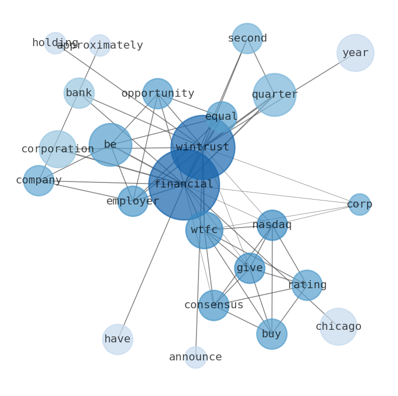 This document will help you to evaluate Wintrust Financial without reading an infinite amount of sources. Relying only on stock quotes or prices to make investment decisions is a mistake. Analyzing and observing stock charts, highs and lows and other numerical data does not allow to evaluate the real value of a company. Stock quotes and prices are the result of underlying characteristics of a company and of events and news happening around them. For this reason, investing must be based on information, not numbers. As a solution, we programmed an artificial intelligence that reads the whole internet and the uses natural language processing and vectorizers to summarize the information. Usually, the AI reads several hundred pages and summarize it to a short document. This document presents our results. We found that the most common words in the internet about Wintrust Financial are: Wintrust, Financial, quarter, financial, year, Chicago, Corporation, …