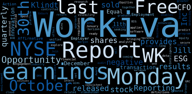 How much time have you spent trying to decide whether investing in Workiva? Many investors start with the dream of being free. They expect to find on the stock market an option to have time to develop their own interests and hobbies. That is, a way to escape a 9 to 5 job. However, investment is complex and investors end up spending whole days (and nights) trying to figure out which the right stock to invest is. The dream of stock investing becomes the nightmare of facing infinity amounts of information. As a solution, we programmed an artificial intelligence that reads the whole internet and the uses natural language processing and vectorizers to summarize the information. Usually, the AI reads several hundred pages and summarize it to a short document. This document presents our results. We found that the most common words in the internet about Workiva are: Workiva, earnings, …