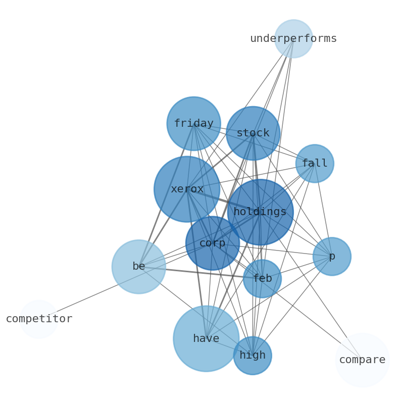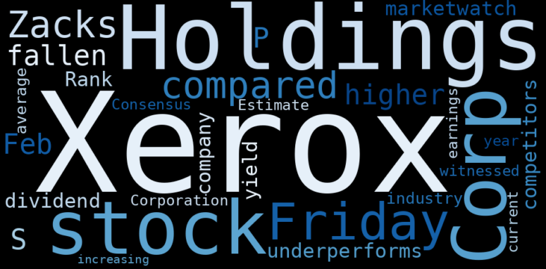 This document will help you to evaluate Xerox Holdings without reading an infinite amount of sources. Relying only on stock quotes or prices to make investment decisions is a mistake. Analyzing and observing stock charts, highs and lows and other numerical data does not allow to evaluate the real value of a company. Stock quotes and prices are the result of underlying characteristics of a company and of events and news happening around them. For this reason, investing must be based on information, not numbers. As a solution, we programmed an artificial intelligence that reads the whole internet and the uses natural language processing and vectorizers to summarize the information. Usually, the AI reads several hundred pages and summarize it to a short document. This document presents our results. We found that the most common words in the internet about Xerox Holdings are: Xerox, Holdings, stock, compare, Zacks, Corp, fall, …