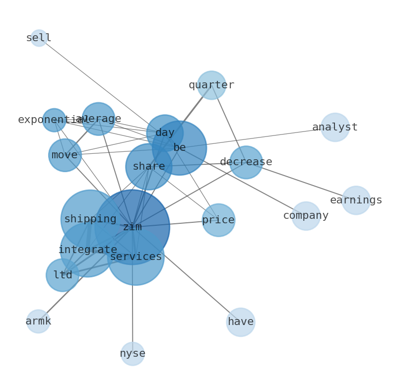 The game is changing. There is a new strategy to evaluate ZIM Integrated Shipping Services fundamental value, possible risks and most salient advantages. Investors have traditionally relied in reading large amounts of text to evaluate the fundamental value of a stock or company. However, the development of Artificial Intelligence (AI) tools is modifying the way investments are evaluated in markets. Today, machine learning, natural language processing and bigdata allow making this process automatic, reducing large amounts of text to the elements that have a higher activation in a neural network. We programmed an artificial intelligence that reads the whole internet and the uses natural language processing and vectorizers to summarize the information. Usually, the AI reads several hundred pages and summarize it to a short document. This document presents our results. We found that the most common words in the internet about ZIM Integrated Shipping Services are: ZIM, Shipping, Services, …