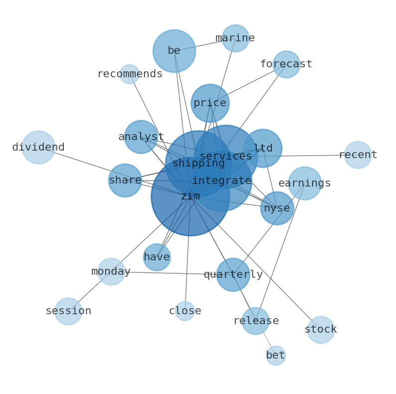 This document will help you to evaluate ZIM Integrated Shipping Services without reading an infinite amount of sources. Relying only on stock quotes or prices to make investment decisions is a mistake. Analyzing and observing stock charts, highs and lows and other numerical data does not allow to evaluate the real value of a company. Stock quotes and prices are the result of underlying characteristics of a company and of events and news happening around them. For this reason, investing must be based on information, not numbers. As a solution, we programmed an artificial intelligence that reads the whole internet and the uses natural language processing and vectorizers to summarize the information. Usually, the AI reads several hundred pages and summarize it to a short document. This document presents our results. We found that the most common words in the internet about ZIM Integrated Shipping Services are: ZIM, Integrated, Shipping, …