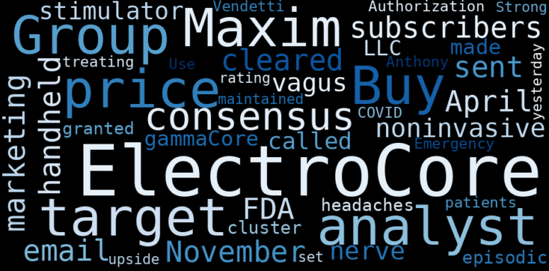 How much time have you spent trying to decide whether investing in electroCore? Many investors start with the dream of being free. They expect to find on the stock market an option to have time to develop their own interests and hobbies. That is, a way to escape a 9 to 5 job. However, investment is complex and investors end up spending whole days (and nights) trying to figure out which the right stock to invest is. The dream of stock investing becomes the nightmare of facing infinity amounts of information. As a solution, we programmed an artificial intelligence that reads the whole internet and the uses natural language processing and vectorizers to summarize the information. Usually, the AI reads several hundred pages and summarize it to a short document. This document presents our results. We found that the most common words in the internet about electroCore are: ElectroCore, Maxim, …